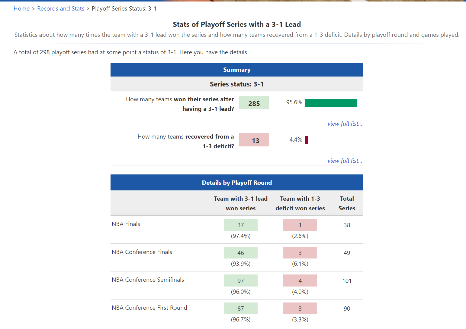 如果步行者能赢下总决赛G4,那么步行者就是3-1领先,从历史来看是285胜13负,夺冠概率就高达95.6%,雷霆就只剩下4.4%的逆袭概率。总决赛3-1领先的球队是37胜1负,夺冠概率高达97.4%,只有16年的骑士队完成过逆袭。